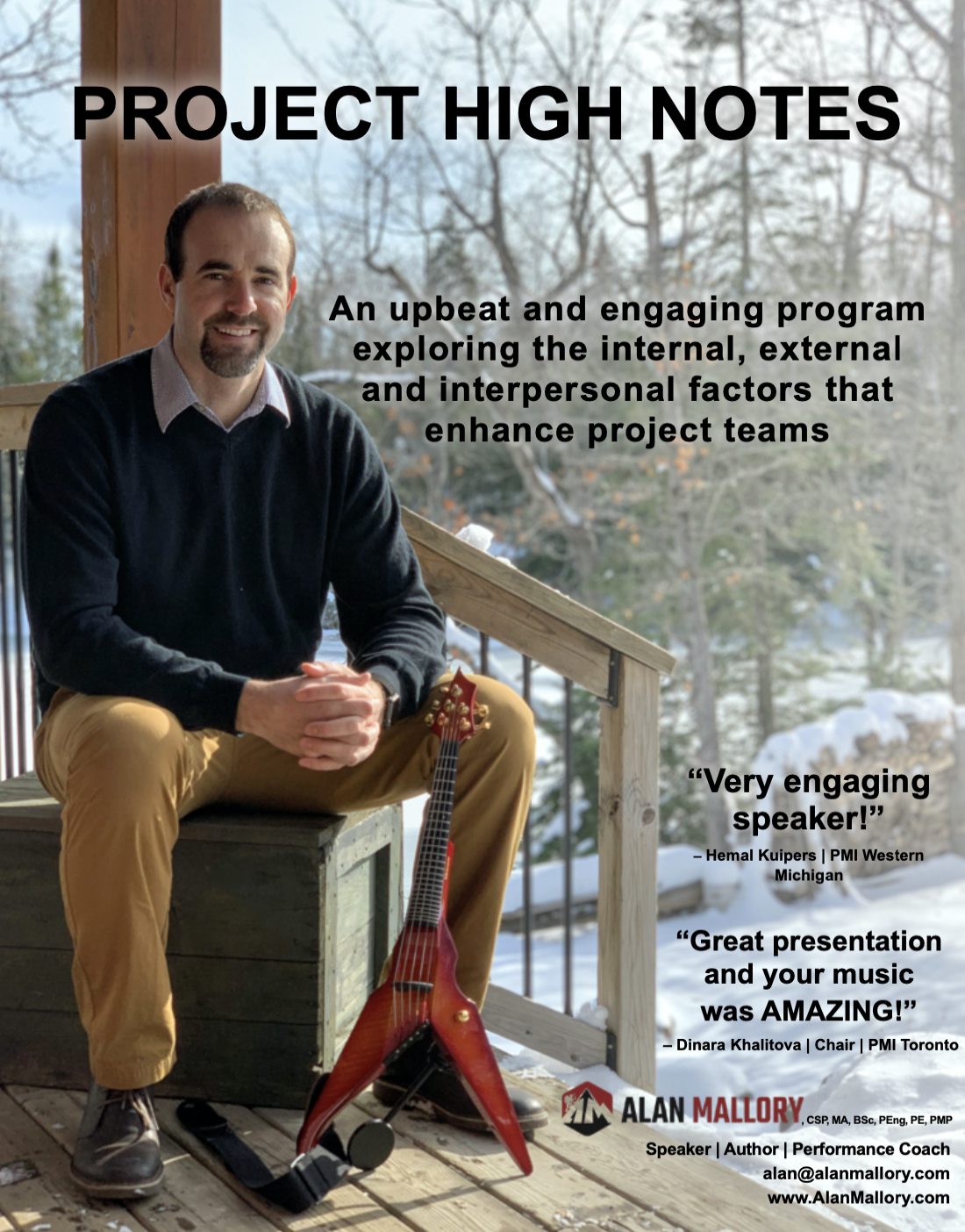 Alan’s engaging keynote focuses on the external, internal and interpersonal factors that connect project teams and allow them to function effectively. Through psychology-based evidence and examples, Alan explores the concepts that project managers need to understand in order to enhance project cohesion. Integrated into this program are live electric violin segments to help illustrate the points Alan is making. This also creates a very upbeat, engaging and entertaining environment for knowledge retention.